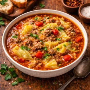 A comforting soup made with ground beef, chopped cabbage, tomatoes, and rice in a rich broth.