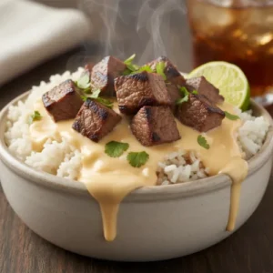 This Steak and Queso Rice isn’t just a copycat recipe; it’s an upgrade. We take tender, seared bites of sirloin and serve them over a bed of fluffy rice that has been simmered in broth and then folded with a rich, homemade cheese sauce. It’s creamy, savory, and incredibly satisfying.